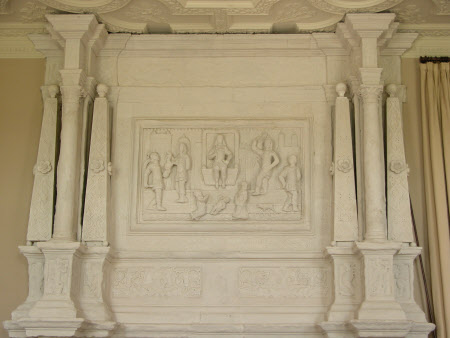 Limestone chimneypiece in the Great Chamber, Fountains Hall. Stone chimneypiece with Caryatids, pilasters, obelisks and carved central panel of the Judgement of Solomon, flanked by the Slaughter of the Innocents.