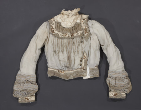 Loose weave grey wool with embroidered grey velvet trim. Slight train. Weighted silk lining. (Bodice 565854.2)