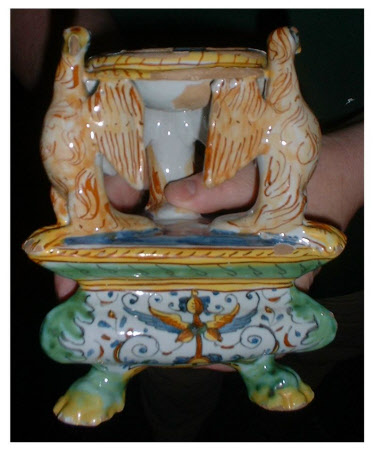 A salt-cellar, the circular bowl resting on the spread wings of three eagles each standing on a triangular base of baluster shape, the bases standing on three lion feet. The eagles are painted in orange, red with yellow beaks and yellow feet, on a blue base which is painted below with green and yellow bands and with typical winged cherubs on all three faces.