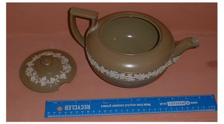 One of two lids for the teapots, in green ground jasperware with white decoration.