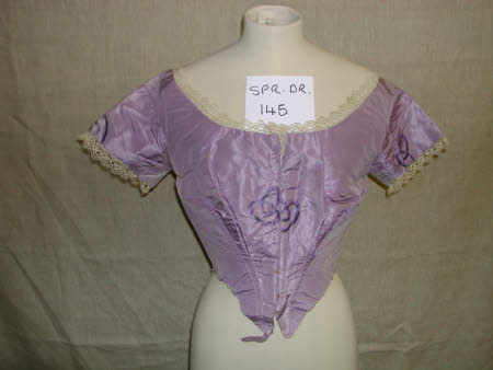 A woman's suit comprised of jacket, skirt, bodice, belt and fragments from historic alterations to the bodice, in lavender taffeta with an abstract chine design, trimmed with fringing and lace edging. Refer to individual records for further details.