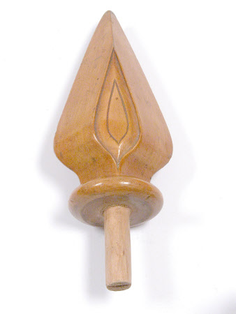 Two spear-shaped finials, one large and one small, for a 19th century curtain cornice/pole with carved detailing and painted with a varnish. Fitted with an iron screw.