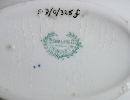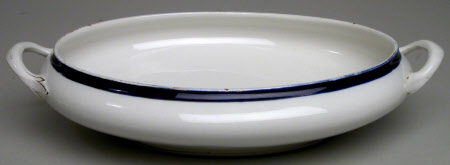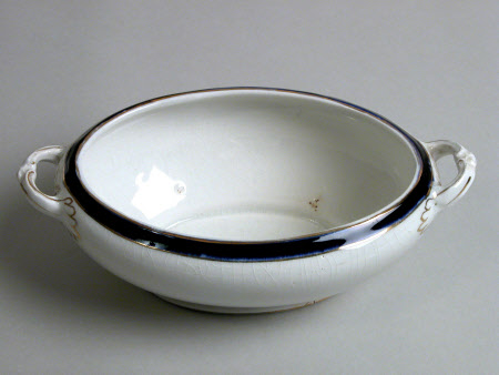A thirteen piece dinner service in white ceramic with blue and gold edging. Other pieces are made by three different companies including Grindley, Meakin and Myott. The service also comprises: two vegetable dishes with one cover (a-c), two oval sauceboat saucers (d and e), one oval sauceboat, ladle and lid (f, g and h), five oval meat dishes of various sizes and from various manufacturers (i - m).