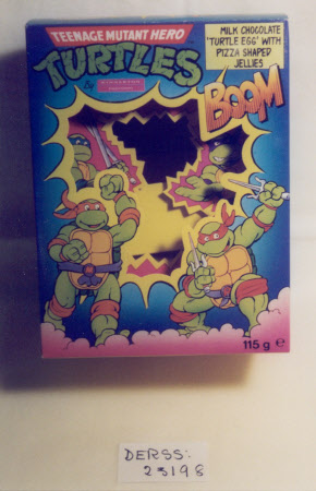 The original box for a Teenage Mutant chocolate egg made of cardboard and covered with highly coloured paper. The front of the box is cut open in a jagged but intentional way to reveal a second cut out. Both cut outs have pictures of turtles waving their weapons round the edges. Across the front of the box, printed in white on a red background, is 'Teenage Mutant Hero' and beneath this 'Turtles' in green and 'Boom' in orange. The box opens with a flap lid, and all the other sides and top have illustrations of turtles. On the flap lid is a price sticker reading 'Gateway 129p'.