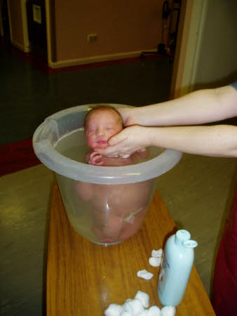 A pale pink, sparkly, plastic 'Tummy Tub' (2006). It is on a pale pink flower-shaped base which can interlock with the stand (catalogued separately) which is embossed with 'Up To 50kg / 110 lb', with a brighter pink flower shape connecting the base to the tub. The tub is a clear plastic, with pink glitter set into it, which has a wide brim and handles either side. The 'Tummy Tub' is designed for new born babies to a 6-months old. It is designed that the baby sits in the foetal position, calmed through total immersion in the water, to make bathing a pleasurable experience for both mother and child. It is lightweight even when full of water. The 'Tummy Tub' promotion on their website reads 'The new concept in bathing babies up to 6 months. The benefits of the TummyTub are acknowledged in maternity hospitals and homes throughout Europe. Endorsed by doctors, midwives and health visitors'. Bought for and used by the donor's baby daughter (Kathryn, born 2006)
