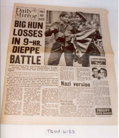 A facsimile tabloid newspaper from the series 'The War Papers'. This is Part 22, containing the Daily Mirror dated Thursday, August 20th 1942, whose headline reads 'Big Hun Losses In 9-Hr. Dieppe Battle'. Printed on the cover is 'Plus Colour Fashion Poster' but this is missing.