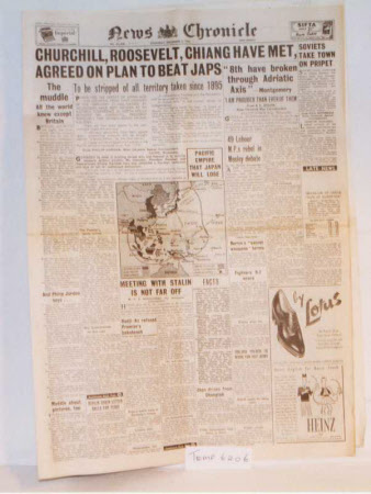 A facsimile broadsheet newspaper from the series 'The War Papers'. This is part 73 containing the News Chronicle dated Thursday, December 2, 1943 whose headline is 'Churchill, Roosevelt, Chiang Have Met, Agreed On Plan To Beat Japs'.