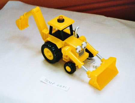 A yellow and black plastic backhoe loader. It has four black wheels, a small pair at the front and a large pair at the back and a friction drive motor. The headlamps and grille are arranged to look like a face. The front scoop and backhoe will move up and down and the backhoe makes a clicking noise when moved. There is an orange warning light (not illuminated) on top of the cab. It is one of the Bob the Builder series.
