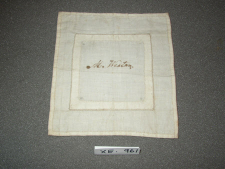 Nine different needlework samplers. There is a cream cotton cuff with button and button hole. There is a cream cotton square with a square cream cotton insertion in the centre. There is a rectangle of cream cotton with 'M S Weston' embroidered in red cross stich. There is a rectangle of red wool with white herring bone stitching and moth holes. There is a rectangle of cream cotton with two cotton tape ties inserted along one edge. There is a rectangle of cream knitted wool with a darned patch in the centre. There is a square green piece of wool with white herring bone stitching and moth holes. There is a rectangle of cream cotton with five pin tucks along its length. There is a doll's size cream cotton long sleeved shirt with the letter 'J' on the shoulders. Total number of items is 9.
