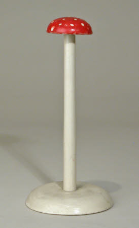 One of eleven wooden toadstool hat stands. White painted base, tall stems with red and white dotted heads. Makers mark on 5 of the hatstands 896. 8 shillings and 1 shilling and a half penny.