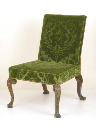 Adam Bowett discusses a chair from a set of ten made for Francis North, 1st Earl of Guilford, probably for his country house at Wroxton Abbey, Oxfordshire. See plate 4:102 'Early Georgian Furniture 1714-1740' The maker is unknown, but payments to both John Boson (1740) and Benjamin Goodison (1756) are recorded in the North papers. Similar legs appear on tables supplied by Goodison to Hampton Court Palace in the 1730s and 40s notably a side table (RCIN 1195) and a pier table (RCIN 251) both with the carved roundels and acanthus on the front of the legs. This 'Kentian' style was popular in the middle years of the 18th century and adopted by several furniture makers, with no specific paper trail linking the suite to Stourhead or the Hoare family it is difficult to attribute an individual maker but Goodison would seem to be the forerunner. James Weedon (March 2018)