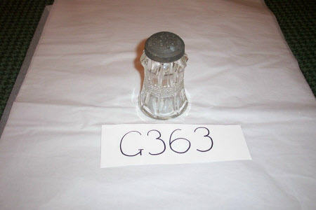 Glass icing sugar/flour shaker with metal top, decorative design around centre.