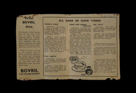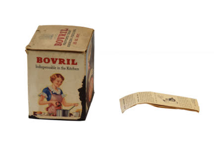 Square cardboard Bovril box with recipe booklet. Box; A white box with flap lid and base printed on five sides. The bottom is plain but has a dark stain covering most of the surface. The top has the royal crest in blue 'DIEU ET MON DROIT' and 'BY APPOINTMENT TO THE LATE KING GEOREGE V.'. In the middle of the lid in red 'BOVRIL' and in black 'PREVENTS THAT SINKING FEELING' and '16 OZ. NET.'. The front of the box carries a picture of the Bovril jar on a blue background, there is a large area of staining to the bottom and outer edges. The right side of the box has a picture of a nurse pouring Bovril onto a spoon with text above that is obscured by a dark stain along the left side and bottom. The back of the box has a small amount of dark stain to the bottom left corner and the black text; 'BOVRIL in the Sickroom Bovril is the concentrated goodness of prime beef, and is so easily assimilated that it imposes no tax on the feeblest digestion. Medical testimony to its value in sickness and convalescence is overwhelming. BOVRIL for Cooking Add a little Bovril to your soups, stews, gravies, hashes and "made" dishes. There is nothing like Bovril for imparting nourishment and flavour. send a postcard for the free Recipe Booklet. BOVRIL for Sandwiches Bovril sandwiches supply the maximum of nourishment in the minimum bulk. delicious and most economical. Spread the Bovril very thinly on thin cut bread and butter.'. The left side of the box has a full colour image of a housewife stood at a pan with a jar of Bovril above which is 'BOVRIL Indispensable in the Kitchen'. There is a small area of black stain to the bottom and right edge. Recipe Booklet; A single white sheet with black print folded in half to form a booklet then folded again vertically in half to form a leaflet that fits in the box with the jar of Bovril. The front when fully folded carries the text; 'You'll enjoy the flavour of BOVRIL Have an appetising cup To-Day. (picture of a mug and a jar of Bovril) There's nothing LIKE BOVRIL in cooking. It makes the flavour delicious and the whole meal more nourishing.'. On the back when fully folded; 'BOVRIL SANDWICHES Bovril spread sparingly is a delicious addition to all sand- wiches, besides increasing their nutritive value. Try Bovril as a "spread" by itself or with cress, cheese, tomato, etc. ....'.