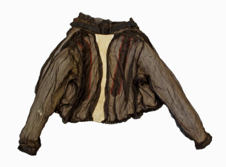 Black nylon blouse with cream lace/netting lining throughout, central lace panel, high neck with decorative black ribbon.