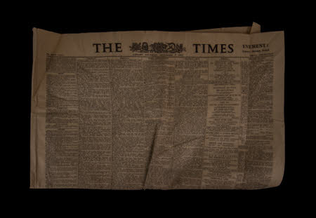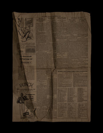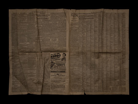 The third in a s stack of seven sets of newspaper pieces, varying shapes sizes and publications, from on top of the Copeland tureens (746487.7 & 746487.11) in the food cupboard. Originally the pieces would have been used to wrap and separate the pieces of diner service kept in the cupboard. A whole sheet of news print pages 1 & 2 and pages 13 & 14 and a single internal page 3 & 4, taken from 'THE TIMES LONDON THURSDAY NOVEMBER 5 1953'