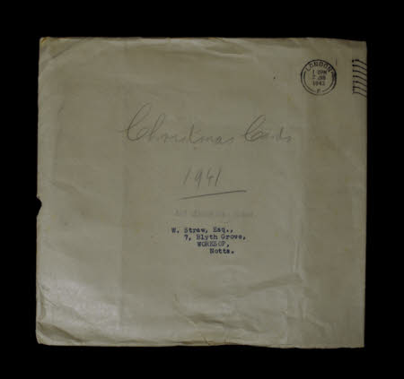 Christmas card collection- large brown envelope with a red George VI 1d stamp in the top right corner, franked LONDON 1 15pm 2 JAN 1942 F and addressed to W. Straw, Esq. , 7, Blyth Grove, WORKSOP, Notts. Across the envelope is written in pencil Christmas cards 1941 The envelope contains nine Christmas cards.