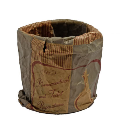 Lidless tin wrapped in a paper bag. The tin is crushed forming a pointed oval at the top rim. The bag has become faded over time with the original colours visible on the bottom, blue, burgundy and cream. The tin has been placed in the bag and the bag folded over. On the front of the bag are the words 'Pharmaceutical and Toilet Preparations' with the image of a flask next to it, on the back 'DEAVILLE Dispensing Chemists 57 Bridge Street, WORKSOP'.