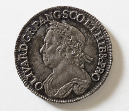 Halfcrown, from the rule of Cromwell. Profile on front. Crowned arms on reverse. 1658