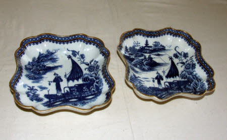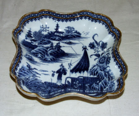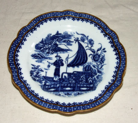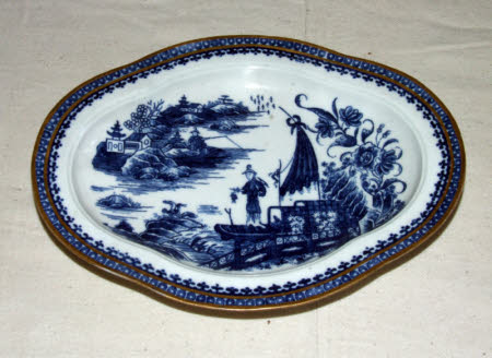 Caughley Salopian service. Blue and white design of oriental scenes of cormorant fisherman on boat by fence with river scene beyond. Blue and gilt geometric border.