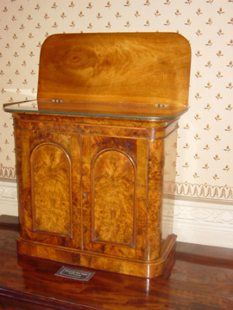 Cabinet of Curiosities. A Victorian period figural burr walnut Cabinet of Curiosities enclosing drawers behind two doors, with a display tray on top covered by hinged lid. Circa 1860. Created by Alexander, Lord Peckover, and added to by his sister Priscilla Hannah Peckover and other members of his family.