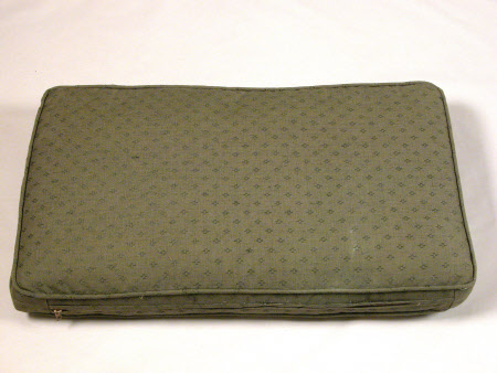 A set of cushion covers in green cotton fabric woven with simple repeated flowerhead pattern.