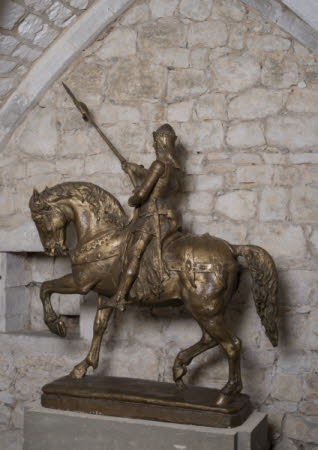 Gold-painted plaster model of equestrian statue of Edward, Prince of Wales, ‘The Black Prince’ (1330–1375), by Edouard Lantéri (1848-1917). The prince is depicted helmeted and in full armour, sword by side and a lance with pennant in his right hand, mounted on his charger. Mounted on a stone base made from stone from the quarry at Corsham in Wiltshire, probably in the 1950s