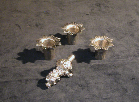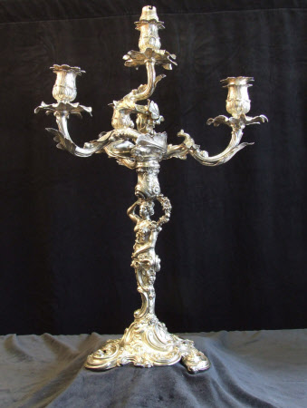 Twelve candlesticks with four-light branches, sterling silver, by Simon Le Sage and James Peltro, London, 1758/9. The candlesticks are cast and chased and consist of irregular triform, domed bases of scrolls and flowers with stems formed as female terms rising out of further scrolls and entwined in floral swags. Each term holds a hand up to a vase-shaped scrollwork and floral socket which is also supported by the continuation of the floral swag (in one case missing). The branches fit into the socket and consist of three spiralling and twisting reeded branches embellished with applied cast and chased leaves and terminating in horizontal calyces of further leaves which form the drip pans. Above are foliate, vase-shaped sockets, the leaves bent over at the top to form a serrated, horizontal lip and the seamed, open-bottomed nozzles having rims shaped to conform. An additional, central socket can either be fitted with a shell and flower finial (one missing when the collection came to the NT in 1956) or with an additional arm which spirals well above the other three and has the same form of socket and nozzle. All of the fourth arms have been drilled for electricity and one stick (no. 3) has had a bolt applied to hold the stick and branches together with the finial in place. Heraldry: On the underside of each candlestick and on the pintle of the branches (except no. 3 which has been altered) are engraved the quartered arms of the Hanoverian monarchs (pre-1801) within the Garter and beneath an imperial crown flanked by the initials G R. Hallmarks: All the branches except those of no. 3, which have been altered, are fully marked on their pintles with the date letter ‘C’, leopard’s head, lion passant and maker’s mark ‘S∙L’ in italics, cup above and mullet below (Arthur Grimwade, London Goldsmiths 1697-1837, London 1990, no. 2576) for Simon Le Sage. The candlesticks are all marked on their undersides. Nos. 6, 7 and 9–12 have the same marks as the branches as do no. 1, except for the lion passant, and no. 5, except for the lion passant and leopard’s head. No. 2 is fully marked but Le Sage’s punch has been struck twice, once over another’s. No. 8 also has Le Sage’s mark and another struck out plus the lion passant and leopard’s head but no date letter. Nos. 3 and 4 are fully marked and struck with both Le Sage’s mark and maker’s mark ‘IP’ beneath a pellet (Grimwade 1990, no. 1575) for James Peltro. All the finials except nos. 1, 2 & 5 are marked with the sterling lion. Scratchweights: On the underside of the candlesticks: ‘1 oz [/] 147 [/] No 1’; ‘2 oz [/] 145 [/]No 2’; ‘3 [/] 147oz [/]No 3’; ‘4 [/] 146 oz [/] No 4’; ‘5 oz [/] 149 ∙ 5 [/]No 5’; ‘6 [/] 148 [/] No 6’; ‘oz [/]153 ∙ 10 [/] N 7’; ‘oz [/] 151 ′ 15 [/] No 8’; ‘9 [/] 154 [/] No. 8’; ‘156oz 10 [/] No 10’; ‘oz [/] 159 10 [/] N ′ 11’; ‘153 oz [/] Nº 12’. All the component parts, including the nozzles, are scratched with the number of the candlestick to which they belong, either with arabic or roman numerals. Not all the parts are still with the correct sticks.