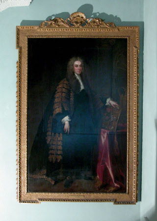 Oil painting on canvas, Charles Talbot (1685 - 1737), 1st Baron Talbot of Hensol as Lord High Chancellor by John Vanderbank the younger (London 1694 - London 1739), circa 1735. A full-length portrait of 1st Baron Talbot of Henson in Lord Chancellor's robes and holding the Lord Chancellor's purse with his left hand, beside a table, in an interior.