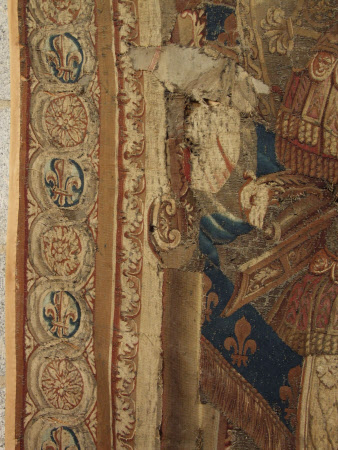 Gobelins Tapestry, late 17th century. Title: ‘Portiere du la Char Triomphe’ Designed by Charles Le Brun and woven at the Gobelins factory. It is a portiere designed to hang in a doorway. The tapestry depicts a triumphal chariot decorated with the arms and attributes of Louis XIV.