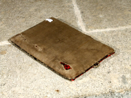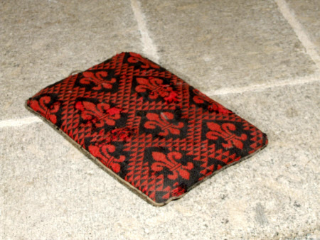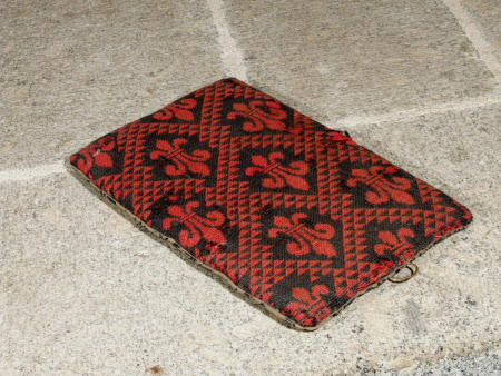 A set of 50 small rectangular Hassocks, stuffed and covered in a tapestry type cotton fabric in black and burgundy. Fleur du lis pattern; 1 - 5.