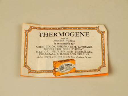 Rectangular, orange cardboard box with white, black, red and yellow decoration. Contains pale orange "Thermogene" brand of medicated wadding impregnated with capsicum and methal salicylate, for rheumatism, neuralgia, bronchitis, etc. Manufactured by the Thermogene Co. Ltd. There is also a leaflet giving usage instructions (not kept together).