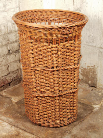 Two tall, octagonal, rush and wicker linen baskets, each with foot ring; (a) with separate lid; (b) without lid.