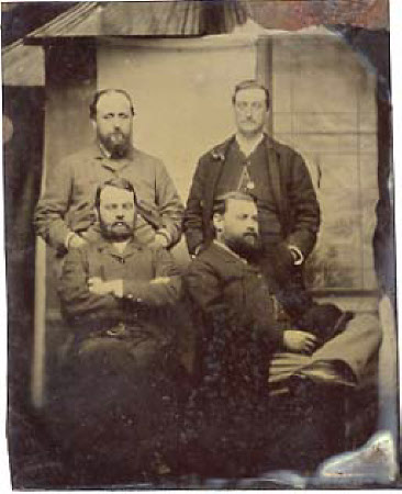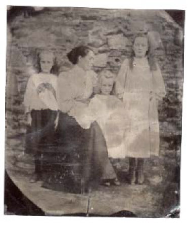 A monochrome tintype, three quarter-length portrait of a woman and child.